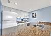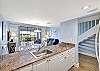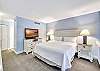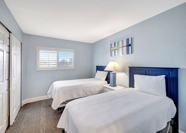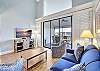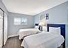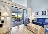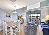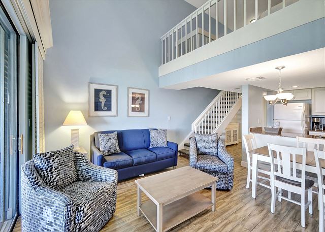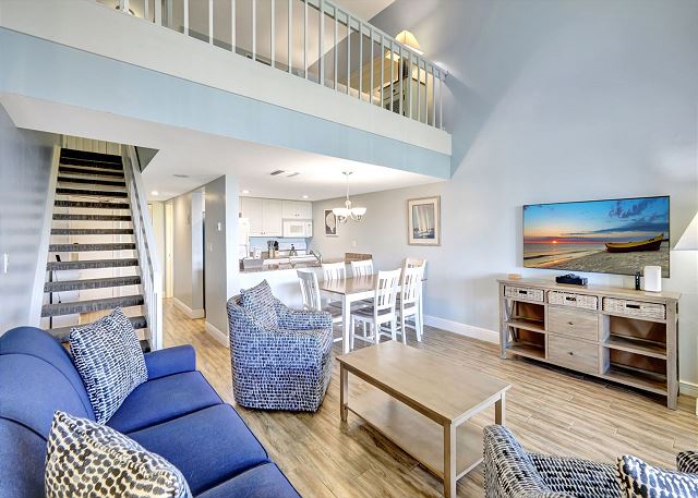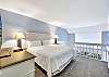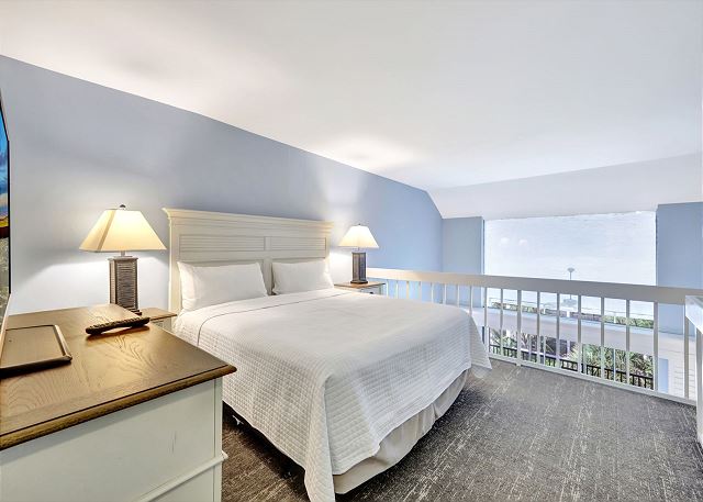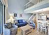 Villa 3131 features a lofted primary bedroom with a king-sized bed, offering privacy and a cozy retreat above the main living space. The guest bedroom includes two twin beds, ideal for children or additional guests. The living room features a queen sleeper sofa, allowing the unit to comfortably sleep up to six guests.