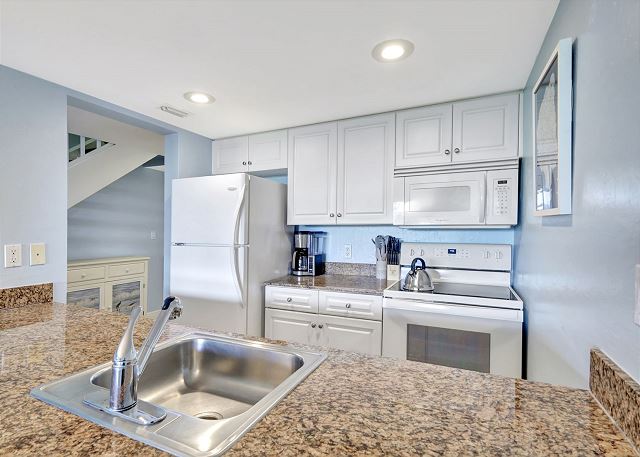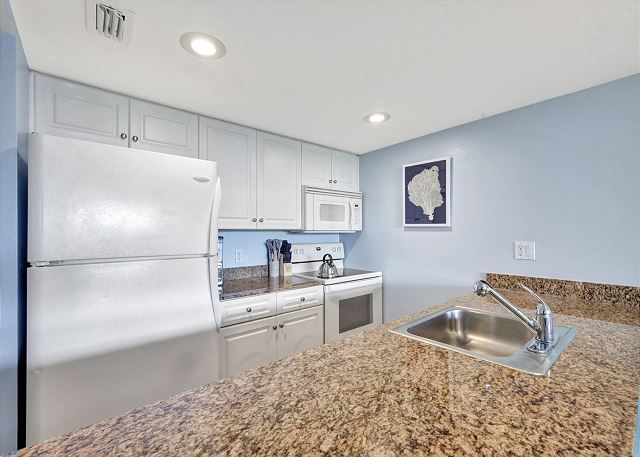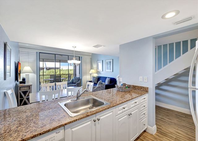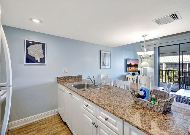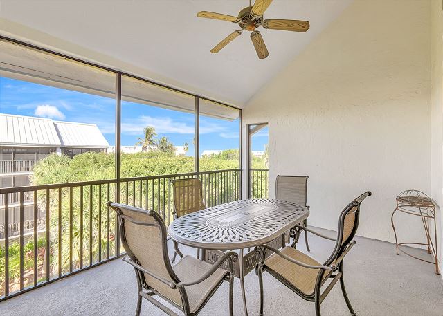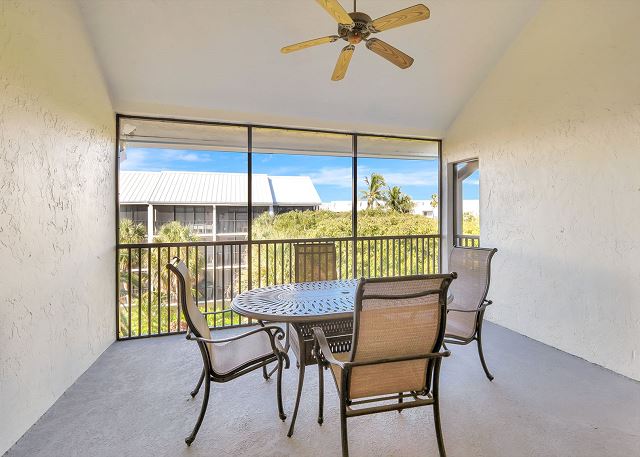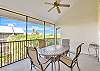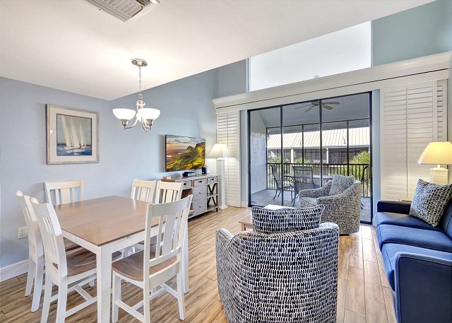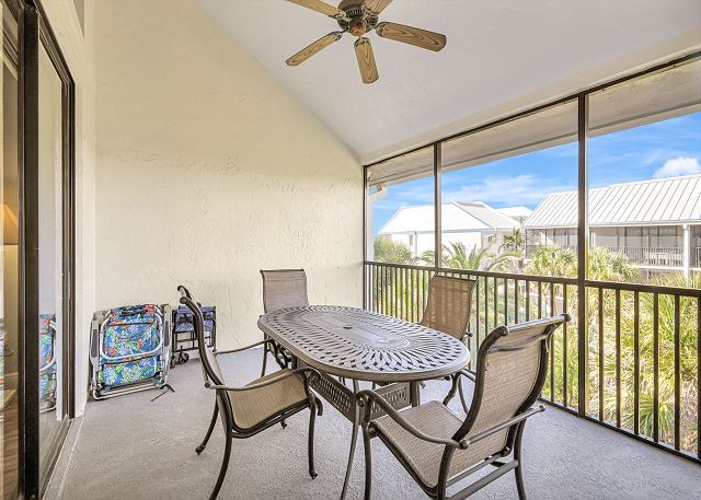 Enjoy a fully equipped kitchen with everything you need to prepare meals, a dining area for gathering, and a screened lanai overlooking the landscaped grounds and pool—perfect for morning coffee or evening cocktails.